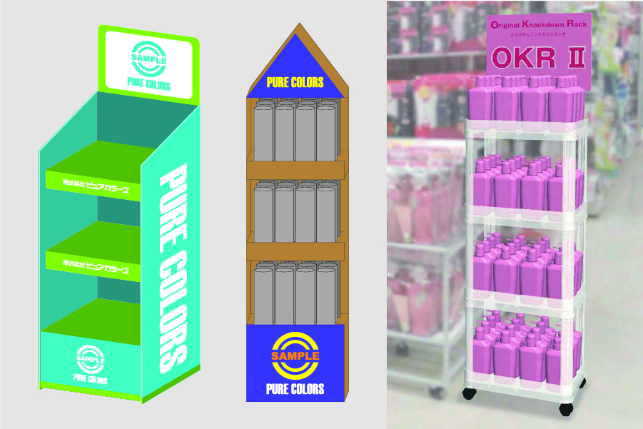 軽量で組立簡単な「紙製」から、重さのあるペットボトル飲料なども陳列できる高強度な「樹脂製」まで、商品に合わせて素材を選べます。