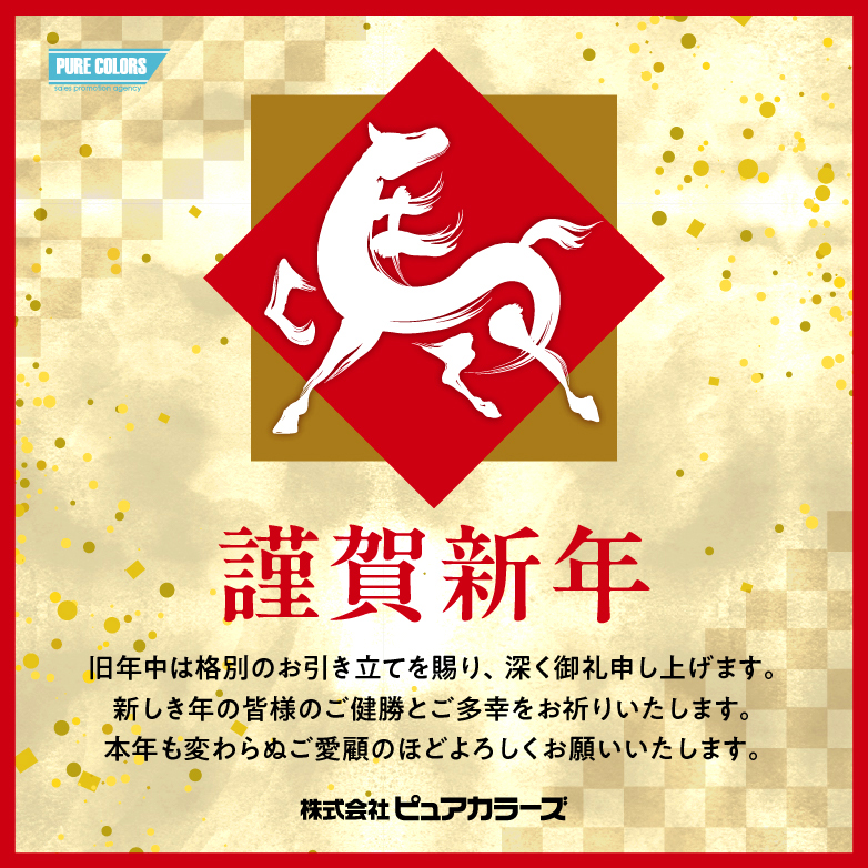 お知らせ 2026.01.05 2026年 新年のご挨拶 新年あけましておめでとうございます。 旧年中は格別のご厚情を賜り、誠にありがとうございました。 本年も社員一同、皆様のお力になれるよう日々精進して参りますので、 昨年同様のご愛顧を賜わりますよう、何卒よろしくお願い申し上げます。 皆様のご健勝と益々のご発展を心よりお祈り致します。 株式会社ピュアカラーズ